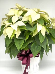 Beautiful and full 8" white poinsettia arrives in a white basket with holiday cellophane and a festive bow.