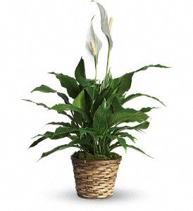 Also known as the peace lily, this dark leafy plant with its delicate white blossoms makes a simply elegant gift. There's nothing small about the sentiment delivered along with this pretty plant.A brilliant green spathiphyllum is delivered in a natural wicker basket.